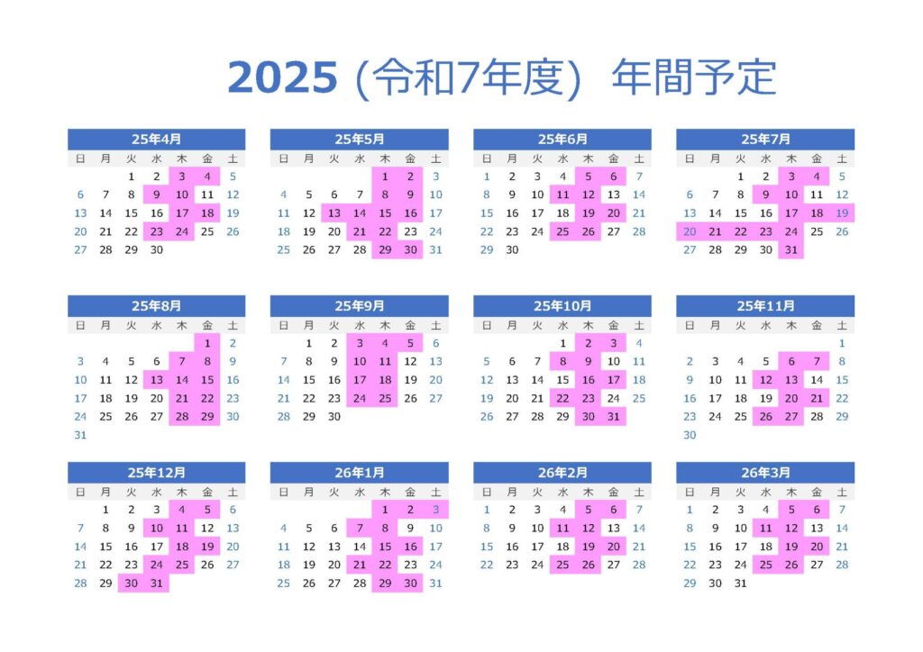 意図としては水曜日、または金曜日しかご来院できない方を考慮してのことです。しかしわかりにくいことや、月初が木金の場合、第2水曜日と第3金曜日が同一週になって意図せず3連休となってしまうこと(2025年では5月、8月が該当します)、などから原則に沿いつつ各月の調整と、あらかじめわかっている行事を含めまして年間の営業日カレンダーを作成致しました。 下記を令和7年度の営業日とさせていただきます。