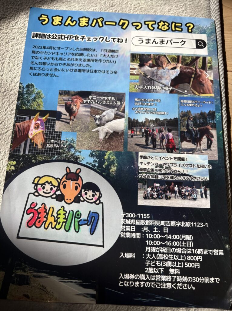 先日、阿見町にある「うまんまパーク」に行ってきました。先月、JRA美浦トレーニングセンターを見学した際にチラシが置いてあり、気になっていた施設です。